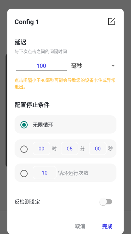 設(shè)置點(diǎn)擊延遲、滑動(dòng)持續(xù)時(shí)間,選擇“無(wú)限循環(huán)”或自定義循環(huán)運(yùn)行次數(shù)、定時(shí)任務(wù)時(shí)間。