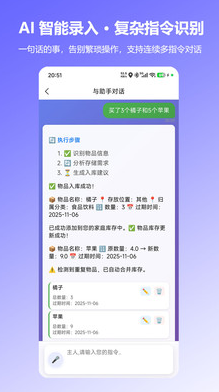 物品與食材管理功能:支持AI智能錄入物品/食材信息,自動統計庫存、設置過期提醒;日常消耗品可開啟自動提醒,避免用完忘記補充,簡化收納管理流程。